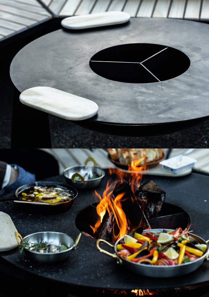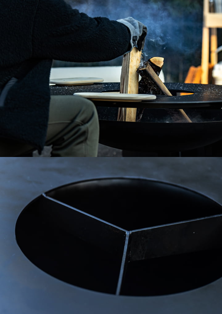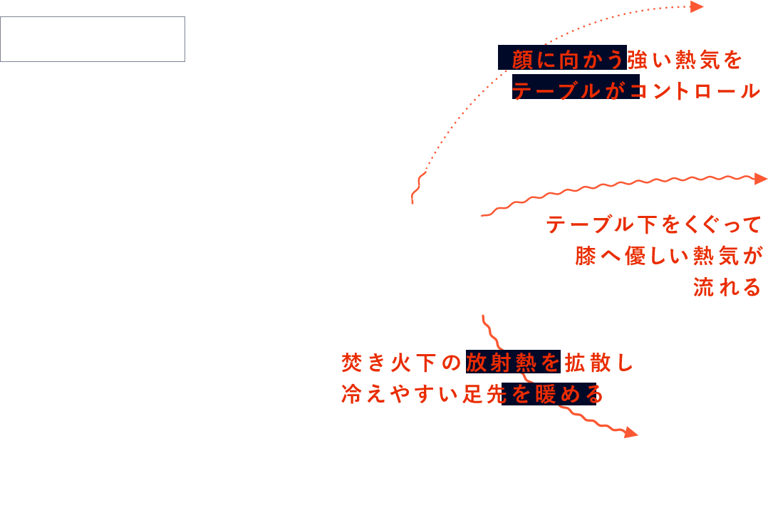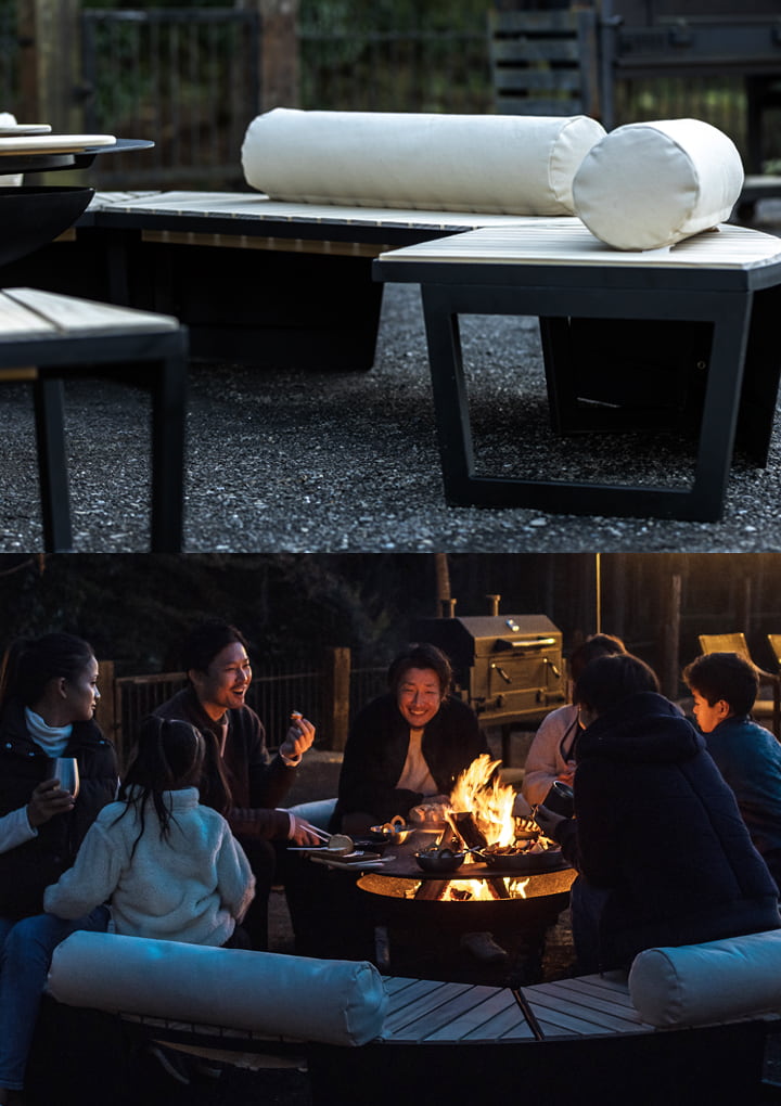 ocotaは、ドーナツ状のテーブルが焚き火の熱気をコントロールしてくれるので顔が熱くなりにくく、逆に冷えやすい足元側に熱気が溜まる独自構造を採用しています。