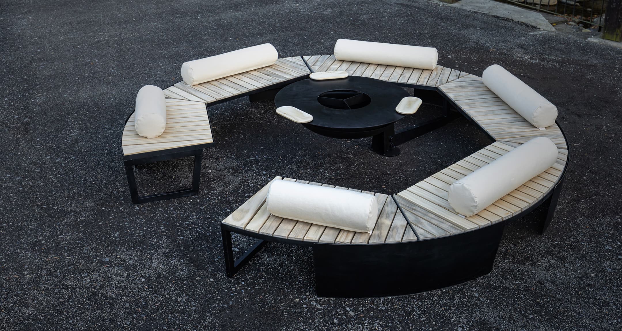 ベンチ&テーブル一体型の、鉄製の焚き火台です。
